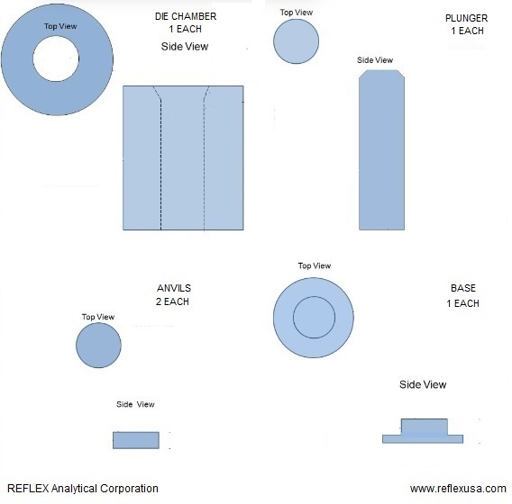 Precision manufactured from hardened 440C stainless steel and includes a main body, a removable base, (2) polished anvils, plunger and extractor ring. The overall assembled height including the die chamber, baseplate, two anvils and plunger but without sample powder is 104mm. The die chamber only dimensions are 50mm height x 45mm outside diameter with each anvil measuring 10mm thickness (two anvils are typically used for pellet fabrication although one anvil could be used for thicker pellet fabrication).